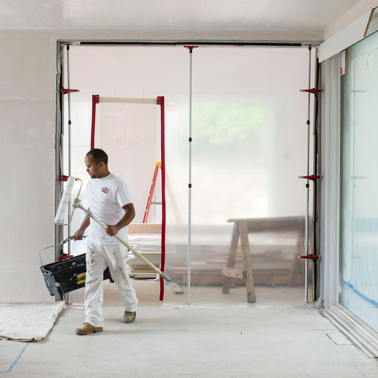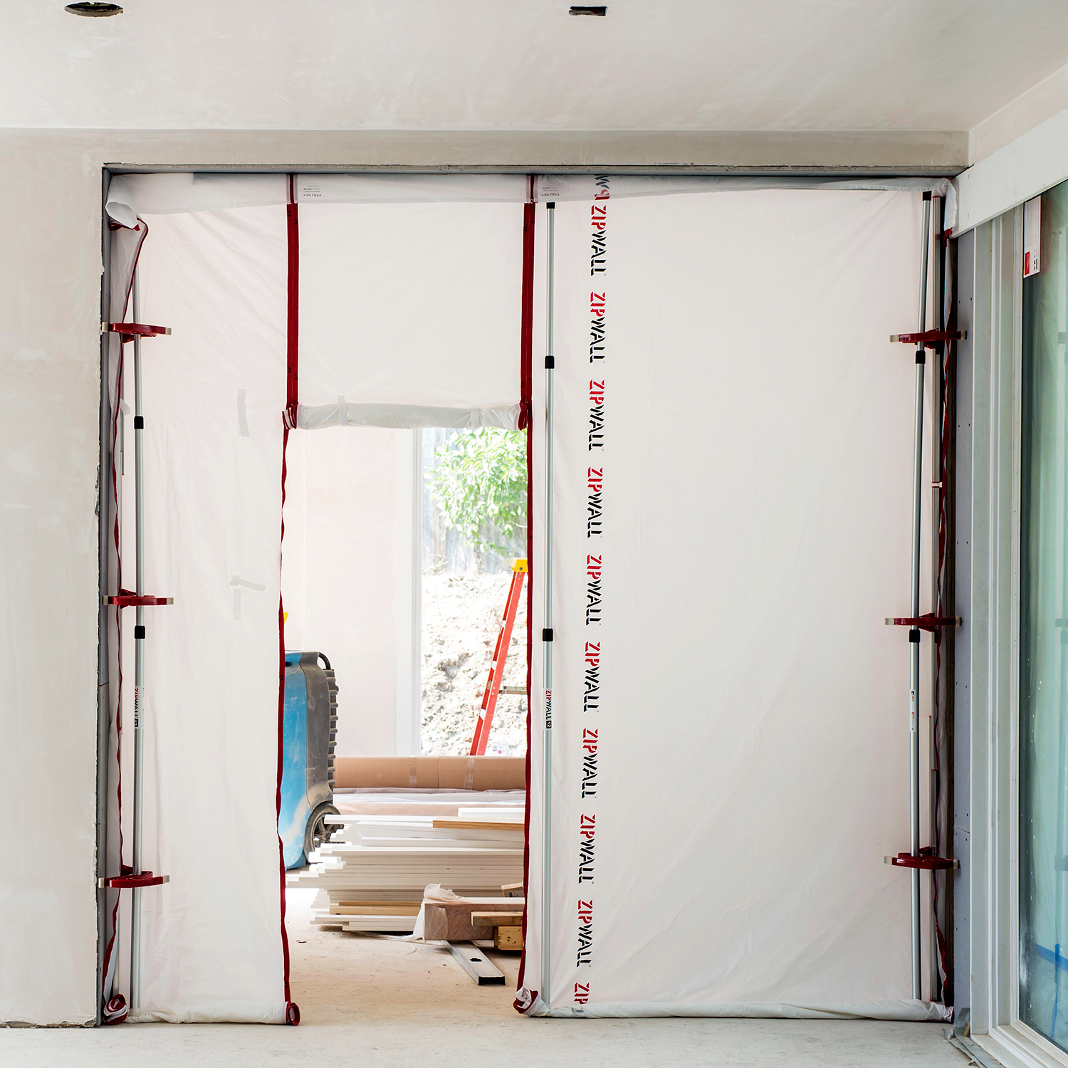 天井面だけでなく壁面の養生シートも密着させることができるサイドクランプ。